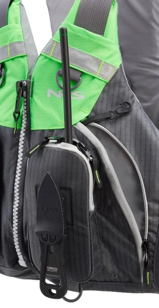 Drei Befestigungslaschen und verschiedene D-Ringe bieten vielfältige Möglichkeiten, Messer, Blinklicht, Signalpfeife und anderes Zubehör zu befestigen. 3M® Reflexpunkte im Schulterbereich erhöhen die Sichtbarkeit. Das Cool Flow System (CFS) verbessert die Ventilation und bietet den nötigen Komfort für lange Tage auf dem Wasser.
