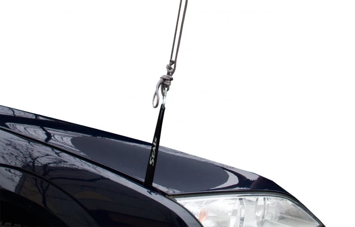 Kinderleicht zu montierende Abspannschlaufen, einfach die Motorhaube öffnen, mit Klemmelement zwischen Haube und Kotflügel einklemmen, fertig.